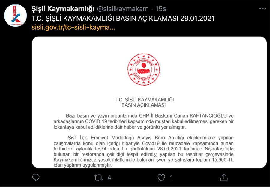 Şişli Kaymakamlığı tarafından sosyal medyada Twitter üzerinden bazı basın yayın organlarında CHP İstanbul İl Başkanı Canan Kaftancıoğlu ile arkadaşlarının Kovid-19 tedbirleri kapsamında müşteri kabul etmemesi gereken bir lokantaya kabul edildiklerine dair haber ve görüntülerin yer aldığı aktarıldı.