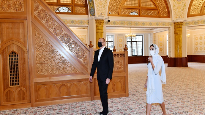 İlham Aliyev ve First Lady Mehriban Aliyeva, Yeni Günaşlı Fatima Zahra Hanım Camii’nin yeni binasında oluşturulan koşullarla tanışıyor